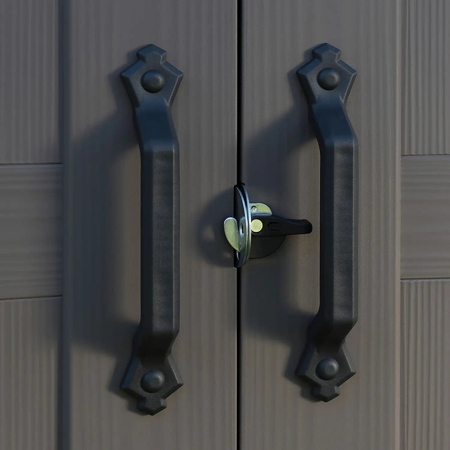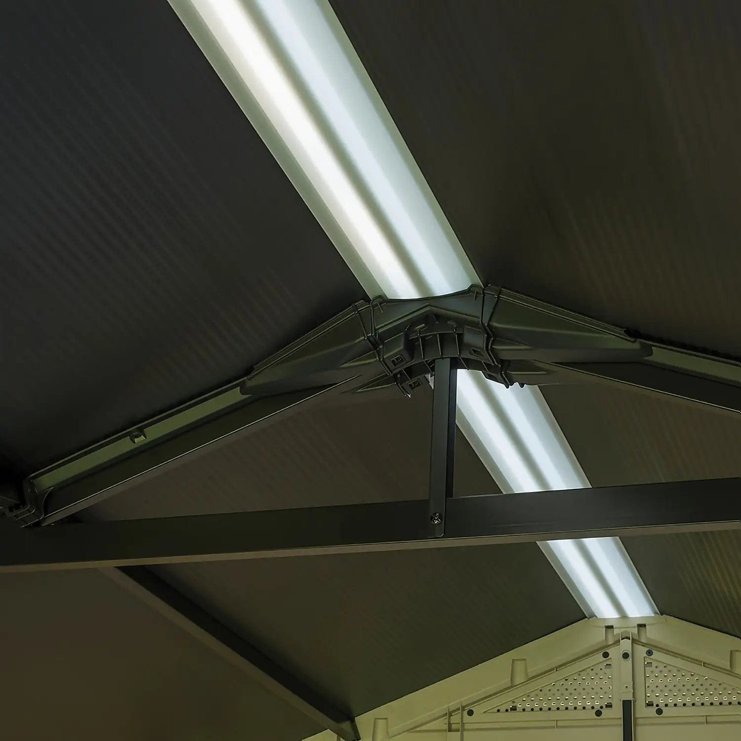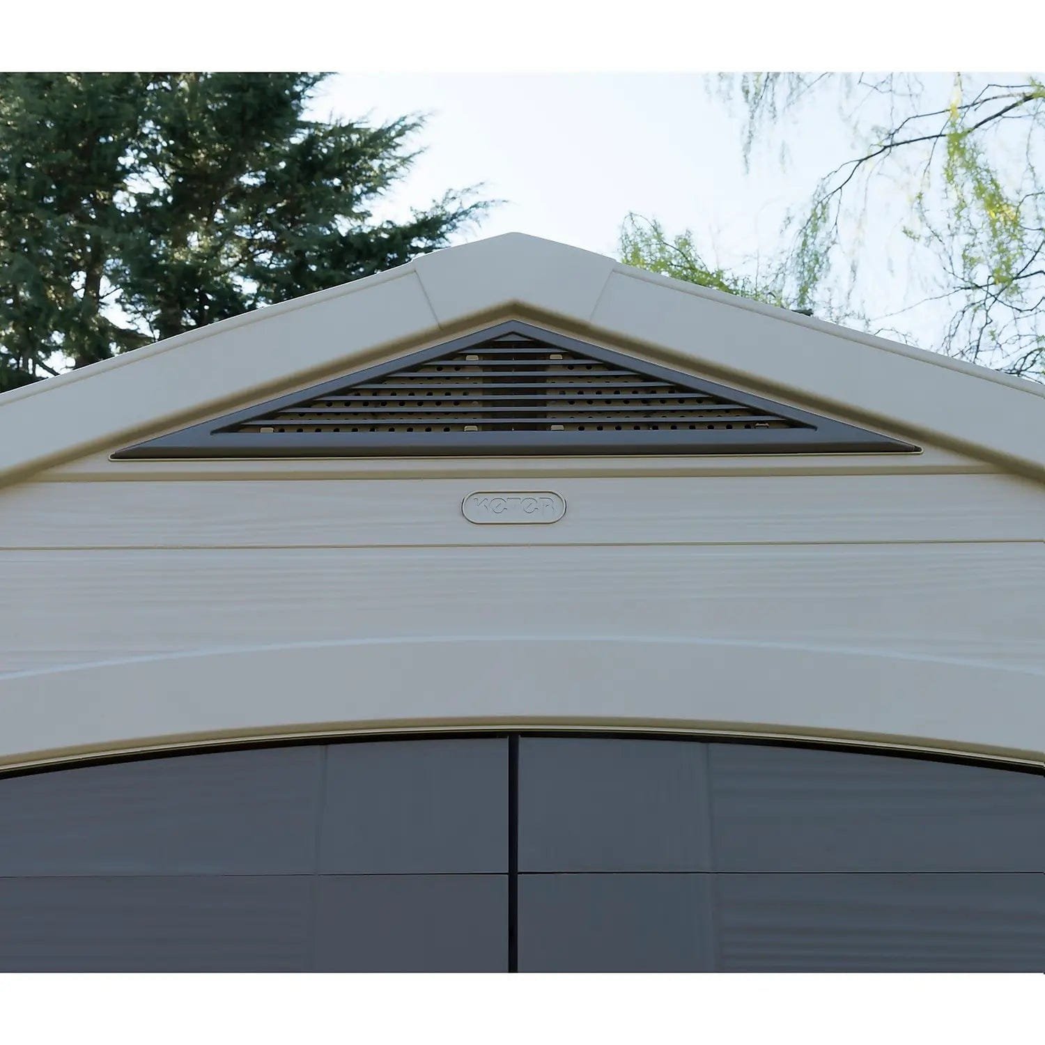 This 8×11 apex Resin (plastic) & steel shed is ideal for storing garden tools, equipment, furniture and sundries, and using as a potting shed.