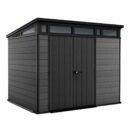 The Keter 9’x 7′ Cortina Heavy Duty Plastic Pent Shed – Dark Grey is modern in every way. With a slanted roof above a band of windows, it boasts a sleek, contemporary design that stores your belongings in eye-catching style. Its double layered walls are made from Evotech, our innovative composite material that gives you the aesthetic look and feel of wood but with the benefits of resin.