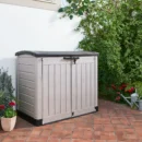 The Store-It-Out ARC is a high-capacity storage shed that provides dry and ventilated storage for up to 1200L of contents. In order to make storage easy it opens from the top or from the front, has an easy-opening lid and a sloped threshold that makes rolling large items in or out simple. With the capacity to hold two 240 L/63 G wheelie bins, there is also a built in shelf support for extra storage options (Shelf not included). This storage bin is easy to assemble and is ideal for storing items ranging from barbecues to lawn furniture.