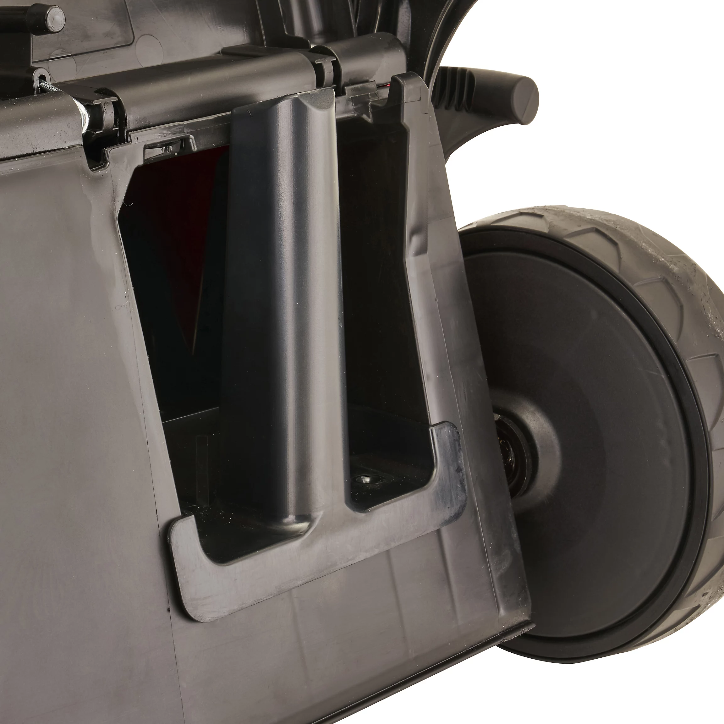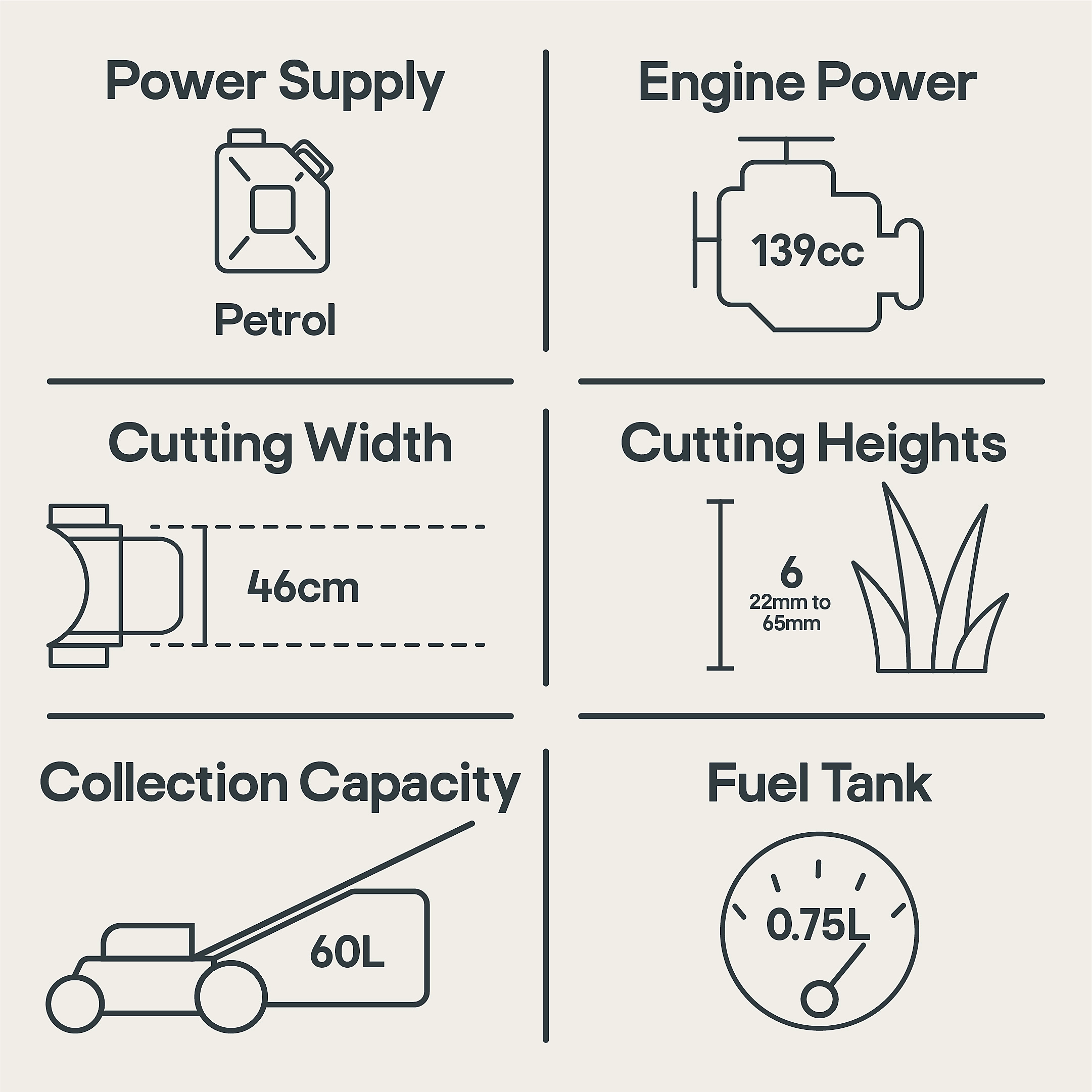 - Rugged powder coated, hard wearing steel chassis with 46cm cutting width and skid plate which reduces scalping of the lawn