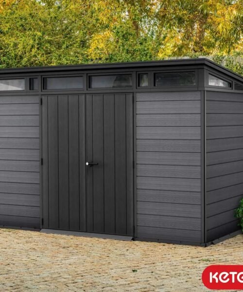 • Keter 9’x 7′ Cortina Heavy Duty Plastic Pent Shed – Dark Grey