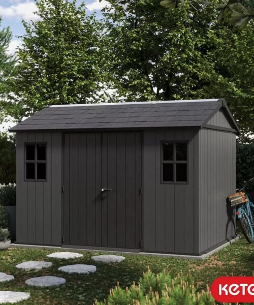 • Keter 11’x7.5′ Newton Plus Side Entry Plastic Shed – Dark Grey
